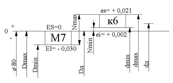 dmax = d + es = 80 + 0,021 = 80,021 мм, dmin = d + ei = 80 + 0,002 = 80,002 мм.
