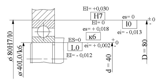 Воспользовавшись таблицами ГОСТ 3325-85 с учетом полученных данных назначаем посадку внутреннего кольца на вал Ǿ40 L0/ к6, а посадку наружного кольца в отверстие корпуса Ǿ80 Н7/l0.