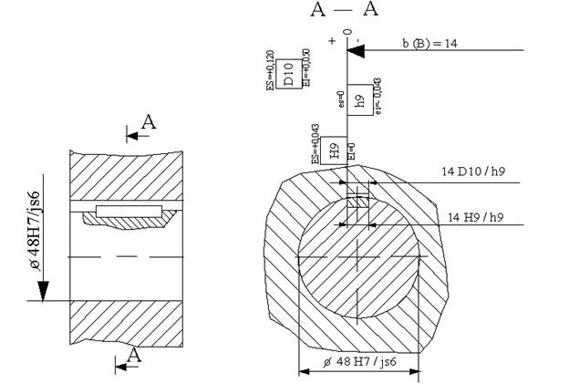 Так как заданы затрудненные условия сборки, действуют нереверсивные равномерные нагрузки, назначаем тип шпоночного соединения на ширину шпонки свободное и устанавливаем следующие поля допусков: на ширину шпонки - h9, на ширину паза вала - Н9, на ширину паза втулки - D 10.