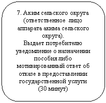 3 | Наименование действия (процесса, процедуры, операции) и их описание | Прием и регистрация необходимых документов, выдача талона потребителю | Составление реестра поступивших документов, направление документов в уполномоченный орган | Назначает пособие, готовит проект уведомления о назначении пособия, либо мотивированный ответ об отказе в предоставлении государственной услуги | Проверяет назначение пособия, подписывает решение о назначении пособия | Подписывает уведомление о назначении пособия либо мотивированный ответ об отказе в предоставлении государственной услуги | Направляет акиму сельского округа уведомление о назначении пособия либо мотивированный ответ об отказе в предоставлении государственной услуги | Выдает потребителю уведомление о назначении пособия либо мотивированный ответ об отказе в предоставлении государственной услуги |