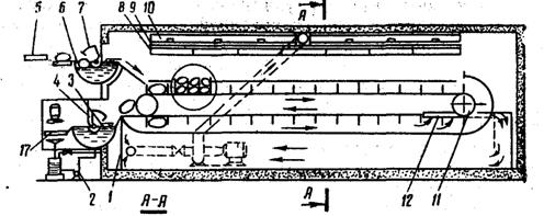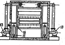 Рисунок 34. Аппарат для замораживания упакованных продуктов в жидком хладоносителе: 1— охлаждающая ванна; 2 - насос для поддержания уровня в загрузочном гидравлическом затворе; 3—разгрузочный гидравлический затвор; 4 — выталкиватель; 5 — транспортер для подачи тушек птицы к загрузочному гидравлическому затвору; 6 — загрузочный гидравлический затвор; 7— выталкиватель; 8—перфорированный поддон; 9 — фильтры; 10 — распределительный коллектор; 11 — транспортерная лента с клетьми; 12 — водосливное отверстие; 13 — циркуляционные насосы; 14—теплоизолированный контур; 15 — испаритель; 16 — бак испарителя; 17 — разгрузочный транспортер с вентиляторами.