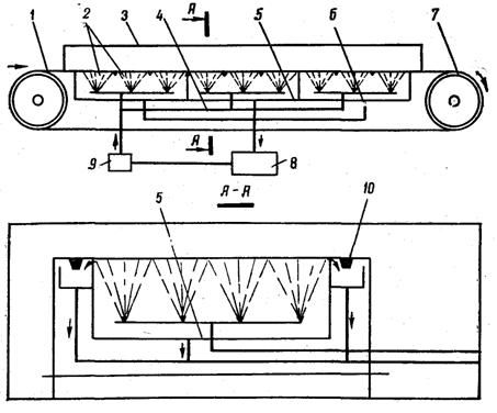 Рисунок 35. Аппарат для замораживания готовых блюд на стальной ленте, орошаемой хладоносителем: 1 — конвейер; 2 — оросительные трубопроводы с форсунками; 3 — теплоизолированный контур; 4 — трубопровод подачи хладоносителя; 5 — поддон; 6 - трубопровод отвода отепленного хладоносителя к испарителю; 7 — барабан; 8 — испаритель; 9 — насос; 10 — боковые резиновые направляющие.
