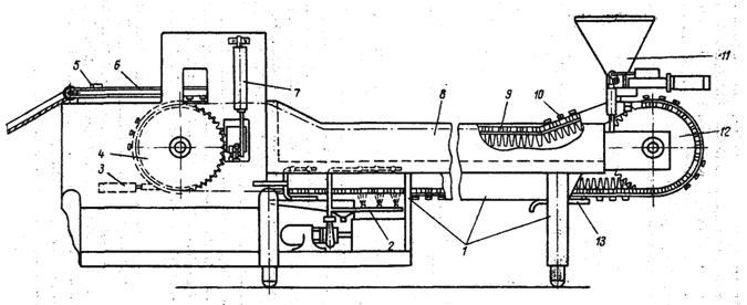 Рисунок 36. Аппарат для замораживания жидких и полужидких пищевых продуктов в формах, погружаемых в ванну с хладоносителем: 1 — рама аппарата; 2 —моющее устройство; 3 — приводное устройство; 4 — приводные звездочки; 5 — замораживаемый блок; 6 — разгрузочный конвейер; 7 — подъемник ванны оттаивания: 8—ванна с хладоносителем; 9 — грузовой (рабочий) конвейер с формами; 10 — извлекатель; 11— наполнитель; 12 — натяжные звездочки; 13 — стерилизатор.