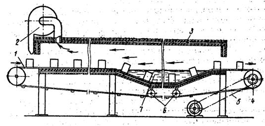 1— грузовой конвейер; 2 — вытяжной вентилятор; 3 — теплоизолированный контур; 4 - барабан; 5 — цепная передача; 6 — направляющие ролики; 7 —ванна с жидким азотом.