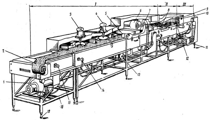 Рисунок 38. Передвижной криогенный аппарат с интенсивным движением газообразного азота: 1 — вытяжной вентилятор; 2 — грузовой конвейер; 3, 4 — циркуляционные вентиляторы для поперечного движения газообразного азота; 5 — шибер; 6, 7 — циркуляционные вентиляторы для продольного движения газообразного азота; 8 — коллектор с форсунками; 9—манометр; 10 —регулирующий вентиль; 11—13 — электродвигатели; 14, /5 — термометры сопротивления; 16 — металлическая рама; 17 —регулировочные винты; I — зона предварительного охлаждения; II — зона орошения: III — зона выравнивания температур.