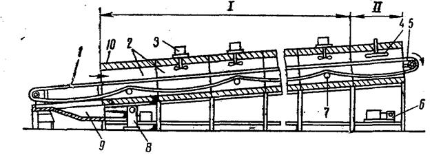 Рисунок 39. Криогенный аппарат с наклонным расположением грузового конвейера, предназначенный для замораживания неупакованных продуктов: 1 — грузовой конвейер; 2 —сборные секции; 3 — циркуляционный вентилятор; 4 — коллектор с форсунками; 5 — ведущий барабан; 6 — электродвигатель привода грузового конвейера; 7 — несущие ролики; 8 — вытяжной вентилятора; 9 — газосборник; 10 — изолированный контур; I — зона предварительного охлаждения; II — зона орошения.