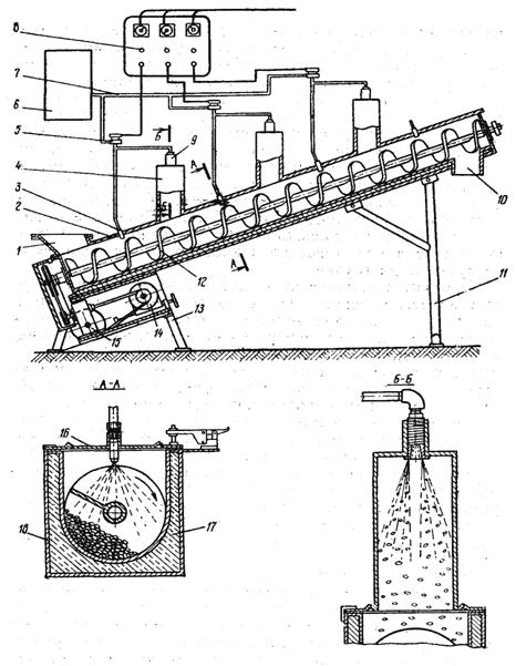 Рисунок 40. Криогенный аппарат с наклонным винтовым конвейером: 1 — загрузочное окно; 2 — теплоизолированный контур; 3 – форсунки; 4 — расширительная камера; 5 — соленоидный вентиль; 6 — бак с жидким азотом; 7 — трубопровод; 8 — пульт управления; 9 — форсунка; 10 — разгрузочное окно: 11, 13 — подставки; 12 — наклонный винтовой конвейер; 14 — электродвигатель; 15 — вариатор скоростей; 16— крышка; 17 — теплоизоляция; 18— наружная обшивка теплоизолированного контура.