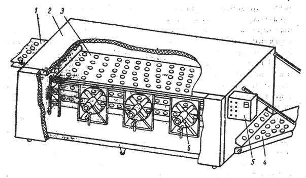 Рисунок 41. Углекислотный аппарат для замораживания кулинарных изделий: 1 — загрузочный транспортер; 2 — изолированный контур; 3 — верхняя секция грузового конвейера; 4 — разгрузочный транспортер; 5 — пульт; 6 — циркуляционные вентиляторы с коллекторами.