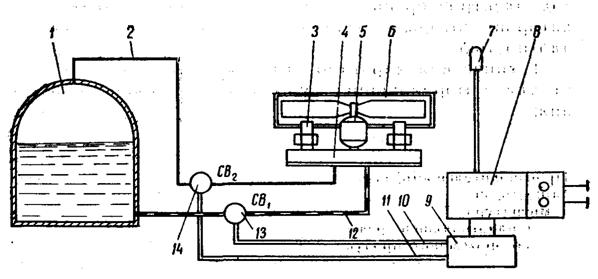 Рисунок 42. Схема автоматического регулирования температуры смеси углекислотного аппарата для замораживания кулинарных изделий: 1 — бак; 2 — газовый трубопровод; 3 —форсунка; 4 — коллектор; 5 — циркуляционный вентилятор; 6 — камера циркуляционного вентилятора; 7 — датчик температуры; 8 —регулятор температуры; 9 — реле времени; 10, 11 - линия связи; 12 — жидкостный трубопровод; 13, 14 — соленоидные вентили.