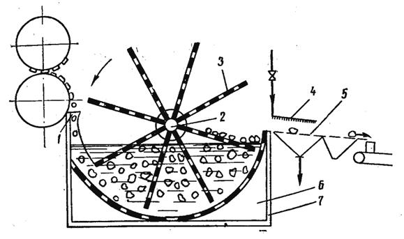 Рисунок 43. Аппарат для замораживания мелкоштучных продуктов хладоносителем: 1 — загрузочная воронка; 2 —пустотелый вал; 3 — вращающиеся перфорированные лопасти; 4 — ороситель; 5 — вибрирующее сито; 6 — ванна с хладоносителем; 7 — изолированный контур.