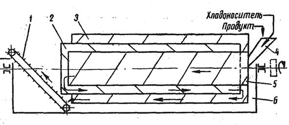 1 —разгрузочный транспортер; 2 — средний барабан; 3—наружный барабан; 4 — загрузочная воронка; 4 — внутренний барабан; 5 — изолированная ванна с хладоносителем. (Стрелки показывают направление движения замораживаемых продуктов).