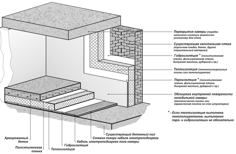 Если под полами холодильных камер находится подвал или другое помещение, то подогрев пола можно не выполнять. В этом случае нужно быть готовым к тому, что на потолке подвала под местом размещения холодильной камеры будет конденсироваться влага или образовываться изморозь.