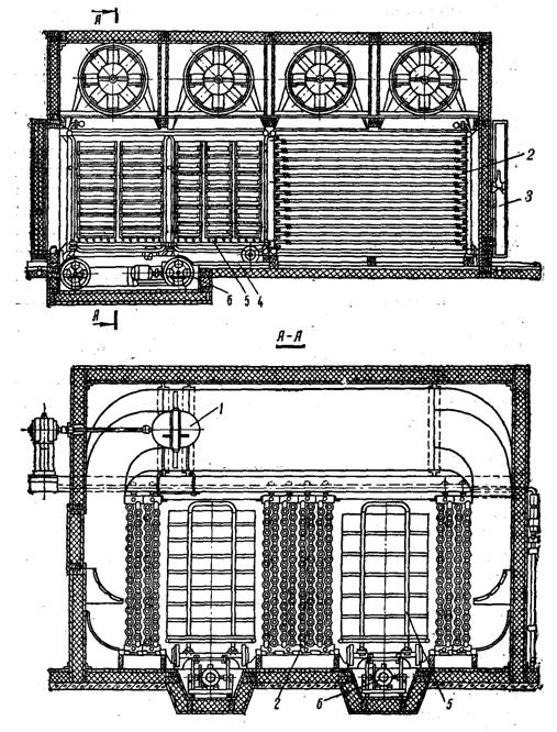 Рисунок 9. Тележечный морозильный аппарат с механизированным перемещением тележек: 1 — вентиляторная установка; 2 — охлаждающие секции; 3 — изолированная дверь; 4 — рельсовый путь; 5— тележки; 6 —устройство для передвижения тележек.