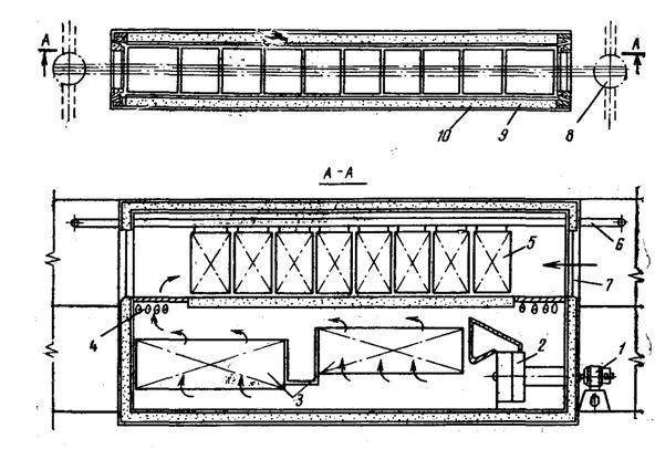 Рисунок 10. Тележечный морозильный аппарат судового типа: 1—электродвигатель; 2 — осевой вентилятор; 3 — воздухоохладитель; 4 —окна с шиберами; 5 — подвесные этажерки; 6 — путь с цепным конвейером; 7 — двери; 8 —поворотный круг; 9 —кожух; 10 — изолированный контур.
