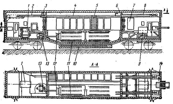 Рисунок 11. Передвижной тележечный морозильный аппарат с механизированным перемещением тележек: 1 — стол для укладки продуктов; 2 — толкатель; 3 — привод цепного конвейера; 4 — рельсовый подвесной путь; 5 — этажерка; 6 — двери грузового отсека; 7 — передвижная тележка; 8 — вытягивающий механизм; 9 — глазуровочный аппарат; 10 — аммиачный ресивер; 11 — воздухоохладитель; 11 — вентилятор; 13 — электродвигатель вентилятора; 14 — стол для упаковки блоков.