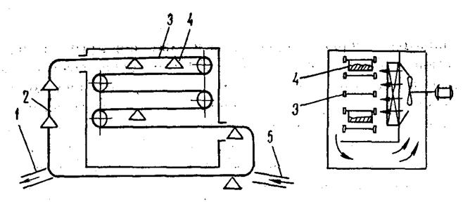 Вентиляторная установка, создающая вынужденное движение воздуха в аппарате, состоит из одного или из нескольких осевых или центробежных вентиляторов. Если электродвигатели вентиляторов находятся в охлаждаемом контуре аппарата, то они должны быть герметичными.