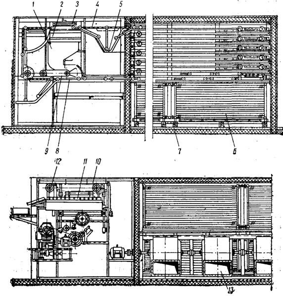 Рисунок 13. Конвейерный морозильный аппарат с параллельной подвеской блок-форм: 1 — загрузочный бункер; 2 — разгрузочный транспортер; 3 — нагреватель; 4 — цепной конвейер; 5 — направляющие; 6 — воздухоохладитель; 7 — изолированный контур; 8 — блок-форма; 9 — питатель; 10 — ванна с водой; 11— глазуровочная площадка; 12 — проталкивающий транспортер; 13 — вентилятор.