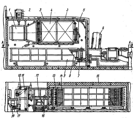 Рисунок 14. Автоматизированный судовой морозильный аппарат типа АСМА: 1 — вентилятор; 2 — электродвигатель вентилятора; 3 — изолированные двери; 4 — воздухоохладитель; 5 — дверь; 6 — разгрузочный транспортер; 7 — опрокидыватель; в —блок форма; .9 — грузовой конвейер; 10 — элеватор; 11— конвейерные цепи; 11 — привод конвейера; 13 — звездочки; 14 — направляющие; 15 — изолированный контур; 16— электродвигатель конвейера; 17 — транспортер-питатель; 18 — бункер.