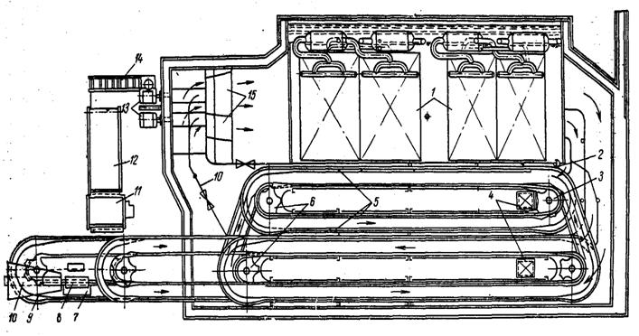 Рисунок 15. Конвейерный морозильный аппарат со спиральным конвейером: 1 - секции воздухоохладителя; 2 — направляющие щиты; 3 — направляющие звездочки цепи; 4 — люки: 5 — цепи конвейера; 6 - экраны; 7 — блок-форма позиции загрузки; 8 — весовой бункер; 9 — транспортер; 10 — бункер питатель; 11— глазуровочная ванна; 12 — ленточный конвейер; 13 - электродвигатели вентиляторов; 14 — рольганг для глазурованных блоков; 15 — вентиляторы.