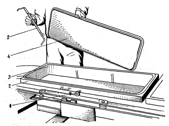 Рыба, подготовленная к замораживанию, поступает в бункер-питатель, откуда транспортером подается в весовой бункер, из которого порциями по 10 кг высыпается в проходящие блок-формы. Рыбу в блок-формах вручную разравнивают и закрывают крышками с пружинными замками. Блок-форма морозильного аппарата показана на рис. 16.