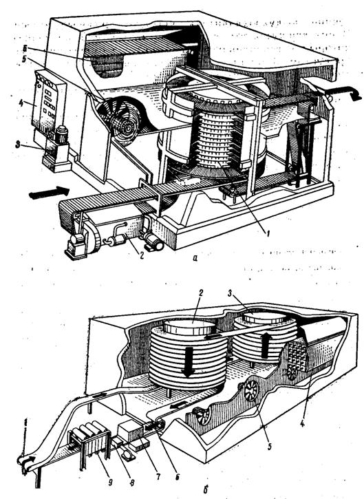а — с одним барабаном: 1 — барабан; 2 —устройство для мойки ленты; 3 — преобразователь частоты; 4— распределительный щит; 5 — вентилятор; 6 —воздухоохяадитель;