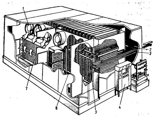Рисунок 18. Конвейерный морозильный аппарат для замораживания готовых блюд в упаковке, хлебобулочных изделий и мороженого: 1 — осевые вентиляторы; 2 — транспортер загрузки; 3 — транспортер выгрузки; 4 — пульт автоматического контроля и управления; 5 — гидравлический цилиндр; 6 — стеллажи; 7 — воздухоохладитель.
