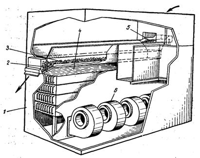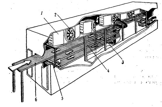 Рисунок 19. Конвейерный морозильный аппарат для замораживания готовых блюд на ленте конвейера: 1 — воздухоохладитель; 2 — вентилятор; 3 — нижний конвейер; 4 — средний конвейер; 5 — желоб; 6 — верхний конвейер.