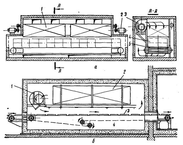 а — с сетчатым конвейером и поперечным движением воздуха: 1 — воздухоохладитель; 2 — привод вентиляторов; 3 — центробежный вентилятор; 4— упакованный продукт; 5 — сетчатый конвейер;