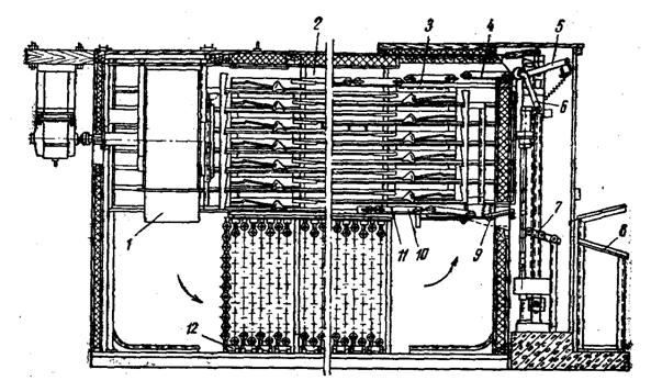 Рисунок 21. Гравитационный морозильный аппарат ГКА-2: 1— вентиляторвая установка; 2 — грузовой отсек; 3 — гребенка; 4— нулевая полка; 5 — стол; 6 — рычаг ввода каретки; 7 — пюпитр; 8 — приемное устройство; 9 — заслонка нижнего окна; 10 — каретка; 11 — блок-форма; 12 — отсек воздухоохладителя.