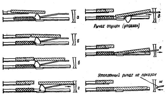 Рисунок 22. Схема перемещения кареток гравитационного морозильного аппарата ГКА-2: а — прием каретки рычагом гребенок; б — переход каретки с полки каркаса на гребенки; в — полный переход каретки на гребенки и момент отхода гребенок; г — отход гребенок и начало опускания рычагов; д — полное опускание рычагов и переход каретки на нижележащую полку; е — сход каретки на нижележащую полку; ж — полный переход каретки на нижележащую полку.