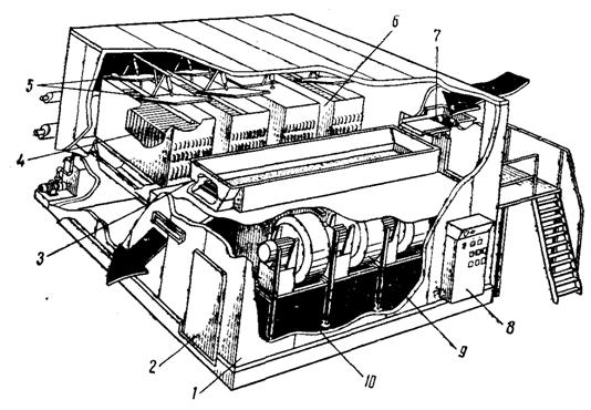 Рисунок 24. Флюидизационный морозильный аппарат средней производительности: 1—теплоизолированный контур аппарата; 2 — дверь; 3 — поддон с перфорированным дном; 4 — секция воздухоохладителя; 5 — щиты для закрытия секций воздухоохладителя; 6 — теплоизолирующая перегородка; 7 — вибрационная решетка; 8 — щит; 9 — вентилятор; 10 — площадка для установки вентиляторов.