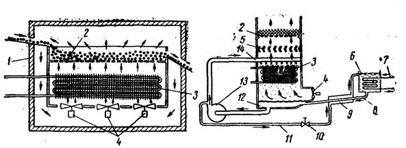 Рисунок 25. Флюидизациокный морозильный аппарат большой производительности с орошаемым воздухоохладителем: 1 — теплоизолированный контур; 2 — поддоны с перфорированным дном; 3 — воздухоохладители; 4 — вентиляторы; 5 — каплеотделители; 6 — реконцентратор этиленгликоля; 7 — паровой змеевик для выпаривания воды из этиленгликоля; 8 — трубопровод для возврата этиленгликоля в поддон; 9 — теплообменник; 10 - вентиль; 11 — трубопровод для подачи этиленгликоля в концентратор; 12 — поддон с раствором этиленгликоля; 13 — циркуляционный насос; 14 — оросительная гребенка.