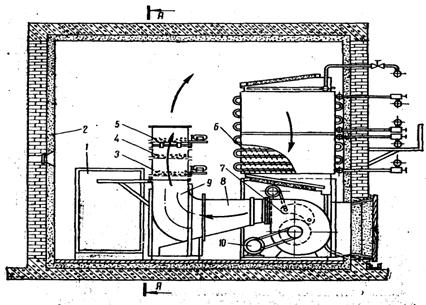 Флюидизационный аппарат с многоярусными решетками (рис. 26) включает изолированный контур, состоящий из двух отсеков, устройство предварительного охлаждения и жалюзийные шторки, предназначенные для изменения количества воздуха и направления его движения, центробежные вентиляторы и воздухоохладитель.