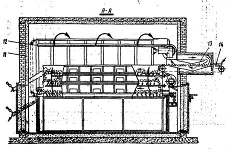 Рисунок 26. Флюидизационный морозильный аппарат большой производительности с многоярусными решетками: 1 — туннельный отсек; 2— теплоизолированный контур; 3 — нижняя неподвижная решетка; 4 — средняя неподвижная решетка; 5 —верхняя неподвижная решетка; 6 — воздухоохладитель; 7 — центробежный вентилятор с электродвигателем; 8—диффузор; 9 — воздухораспределительный канал; 10 — двухскоростной электродвигатель центробежного вентилятора; 12 — воздухоохладитель; 13 — устройство предварительного охлаждения и подсушки продукта; 14 — транспортер подачи продукта в аппарат.