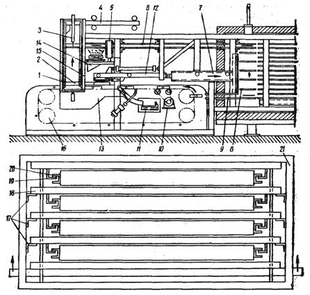 1 — транспортер загрузки; 2 — блок-форма; 3 —подъемный лифт; 4, 15 — автоматические толкатели; 5 — автоматические дозирующие весы; 6 — осушающие плиты; 7 —толкающие устройства; 8 — гидравлические опускающееся лифты; 9 — оттаивательные плиты; 10 — виброустройство; 11 — приемный транспортер; 12 — автоматическое устройство для подачи упакованного продукта в блок-форму; 13 — моечное устройство; 14 —желоб; 16 — устройство для перемещения блок-формы к месту разгрузки; 17 — опоры для морозильных плит; 18—морозильные плиты; 19 — рельсы; 20 — роли блок-формы; 21 —изолированный контур.