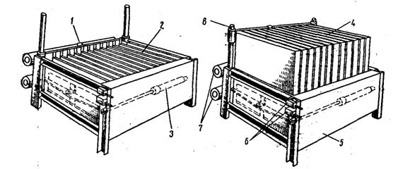 Рисунок 28. Вертикально-плиточный аппарат с подвижными плитами: 1 —стальная рама; 2 —вертикальные морозильные плиты; 3 — гидравлический цилиндр; 4 — замораживаемые блоки; 5 — боковые стенки; 6 —- приборы управления гидравлическим приводом; 7 — коллекторы холодильного агента; 8 — вертикальные направляющие.