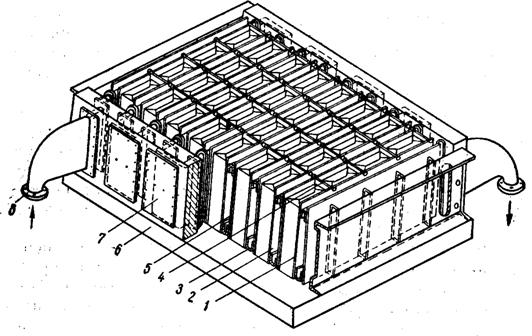 Рисунок 29. Мембранный морозильный аппарат: 1 — резиновая манжета; 2 — мембранная камера; 3 — ограничитель; 4— блок мяса; 5 — стальная мембрана; 6 — подвижное дно; 7 —коллектор; 8 —патрубок для хладоносителя.