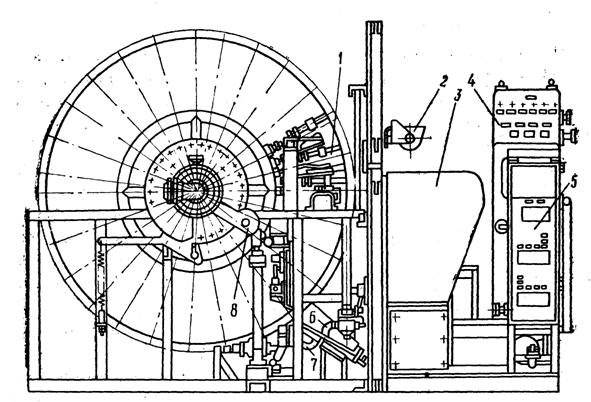 Рис. 30. Автоматизированный роторный морозильный аппарат типа АРСА-3-15Р: 1 — механизм открытия морозильной секции; 2 — дозирующее устройство; 3 — загрузочное устройство; 4 — приборы управления электрической системы; 5 — приборы управления гидравлической системой; 6 — транспортер выгрузки блоков; 7 — механизм срыва блоков; 8 — механизм поворота блоков.