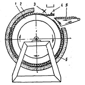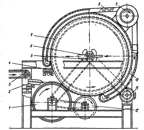 Подача продукта осуществляется с помощью входного конвейера, вибролотка и питающего барабана, который выполнен многослойным и состоит из стальной обечайки и упругого материала. Привод барабанов осуществляется от общего электродвигателя, и скорости вращения их примерно одинаковы. Разгрузка продукта из аппарата происходит с помощью наклонного вибролотка, на котором закреплен нож.