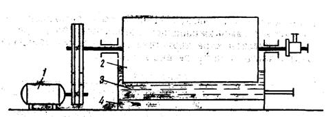 Рисунок 33. Морозильный аппарат барабанного типа для замораживания жидких пищевых продуктов: 1 — привод; 2 — барабан; 3 — ванна с продуктом; 4—рама.