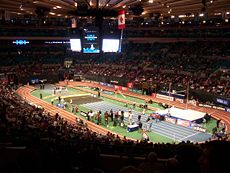 Стандартно включает в себя овальную 200 метровую дорожку, состоящую из 4-6 отдельных дорожек, дорожку для бега на 60 метров и секторов для прыжковых видов. Единственный вид для метаний входящий в программу зимнего сезона в закрытых помещений — это толкание ядра и, как правило, он не имеет специального сектора и организуется отдельно на месте других секторов. Официальные соревнования IAAF проводятся только на 200 метровой дорожке, однако существуют также и стадионы с нестандартной дорожкой (140 метров, 300 метров и другие).