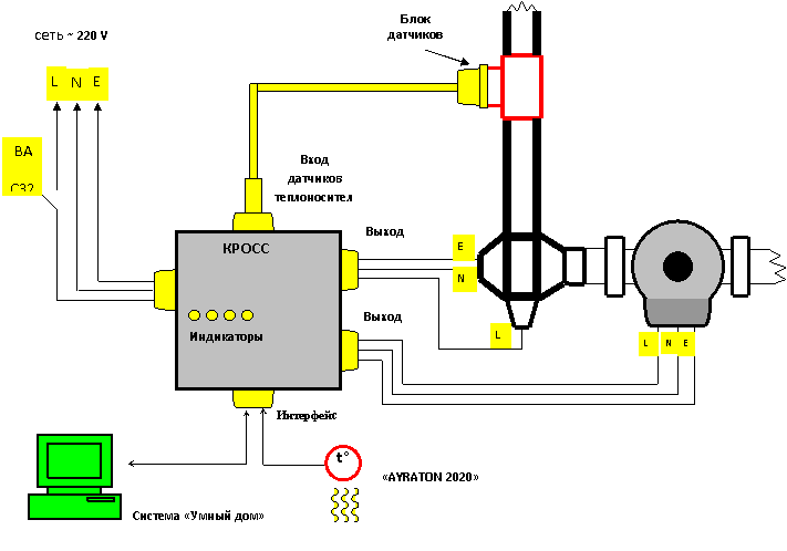 Функционально «КРОС» состоит из четырех контроллеров (см. ниже), регулятора мощности котла и электронного ключа управления насосом.