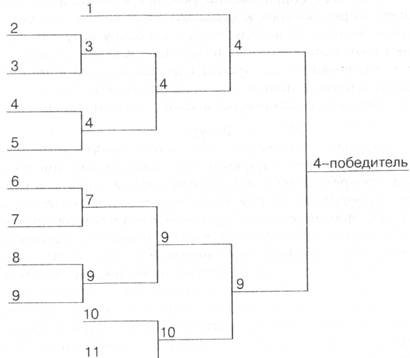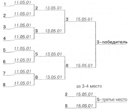 Жеребьёвкой определён номер команды. В протоколе команды располагают в колонку согласно полученным номерам. Рассмотрим число команд кратное 2П, где п степень числа 2 (2,4,8,16,32,64 и т.д.). При этом числе команд они все вступают в игру с первого тура. Первый играет со вторым, третий с четвёртым и т.д. Победители первого тура играют попарно между собой как они записаны в сетке соревнований. Пары образуются сверху вниз. Тур, в котором встречаются 8 команд, называется четвертьфинальным, где 4 - - полуфинальным и где 2 - - финальным. Команды, проигравшие в полуфинале, разыгрывают между собой 3-4 места (в нашем примере 2 и 5).