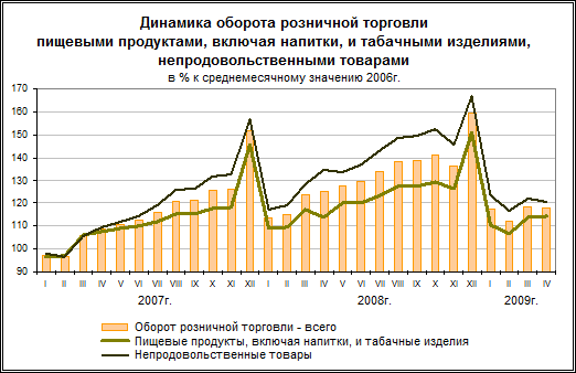 В структуре оборота розничной торговли удельный вес пищевых продуктов, включая напитки, и табачных изделий в апреле 2009г. составил 49,4%, непродовольственных товаров - 50,6% (в апреле 2008г. - 45,7% и 54,3% соответственно).