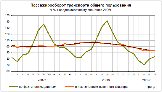 Пассажирские перевозки. Пассажирооборот транспорта общего пользования в январе-апреле 2009г. составил 111,1 млрд. пасс.-километров, в том числе железнодорожного - 40,1 млрд., автомобильного - 44,7 млрд., воздушного - 26,3 млрд. пасс.-километров.