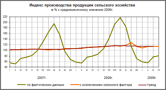 Объем продукции сельского хозяйства всех сельхозпроизводителей (сельхозорганизации, крестьянские (фермерские) хозяйства, население) в апреле 2009г. в действующих ценах, по расчетам, составил 123,6 млрд. рублей, в январе-апреле 2009г,4 млрд. рублей.
