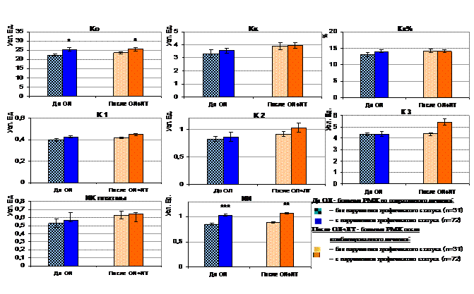 Примечание: * - p<0,05, ** - p<0,01, *** - p<0,001 по сравнению с группой без нарушений трофического статуса, двусторонний непараметрический U критерий Манна-Уитни