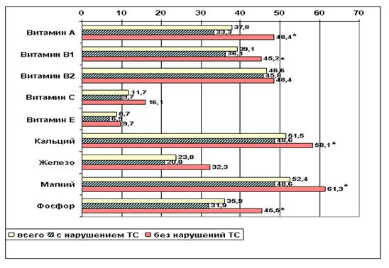 Сниженное содержание в суточном рационе витамина В1 регистрировалось у 39% (40), в группе без нарушений ТС –45,2% (14) и в группе с нарушениями ТС – 36,1% (26). Снижение витамина В2 в суточном рационе у больных РМЖ отмечено в 46,6% (48) случаев, в группе без нарушений ТС –48,4% (15) и в группе с нарушениями ТС – 45,8% (33). Частота сниженного количества в суточном рационе витамина А составила 37,8% (39), в группе без нарушений ТС – 48,4% (15) и в группе с нарушениями ТС – 33,3% (24). Снижение содержания витамина Е в суточном рационе отмечено у 8,7% (9) больных.