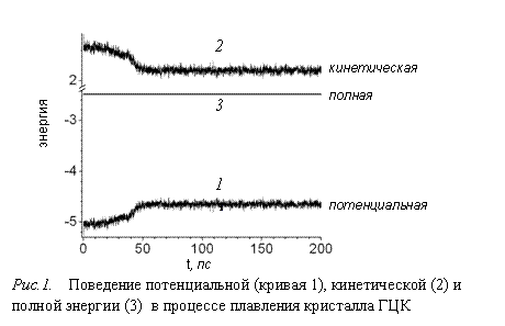Поскольку при плавлении кристалла структура становится неупорядоченной, потенциальная энергия возрастает, а кинетическая уменьшается. При этом полная энергия должна сохраняться. В наших расчетах наблюдается очень хорошее сохранение полной энергии системы. Ей соответствует кривая 3, которая на рис.1 выглядит как прямая горизонтальная линия. Заметим, что на кривых 1 и 2 имеется заметный «шум», означающий флуктуации потенциальной и кинетической энергии в процессе молекулярно-динамической эволюции. Однако эти флуктуации происходят в условиях сохранения полной энергии системы.