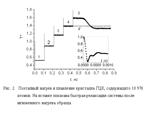 На втором этапе образец мгновенно нагрели до T =1,2. После релаксации температура установилась равной 0,9, (рис.2 область 2). Продолжая такое ступенчатое нагревание, мы достигли температуры 1,6, при которой образец через ~0,1 нс самопроизвольно расплавился (рис.2 область 5). Плавление в нашем ансамбле сопровождается уменьшением кинетической энергии и увеличением потенциальной. Температура образца при этом опустилась до 1,32 ε/kВ.